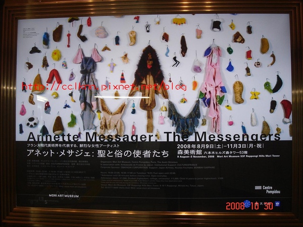 是一名有獨特風格的法國藝術家,她利用各種不同物料,如︰報紙,相片,布,玩具,文具,雜誌,衣服等等去反映出她對世界和政治的悲觀情感和另類的看法。 那一天我剛好去六本木去逛藝術館和博物館。逛到六本木hills時看到她展覽的廣告,我在想「她是誰?」由於她的廣告引起我的興趣和我有的是時間,所以我就買了套票︰Sky Deck和Mori Museum一起逛。