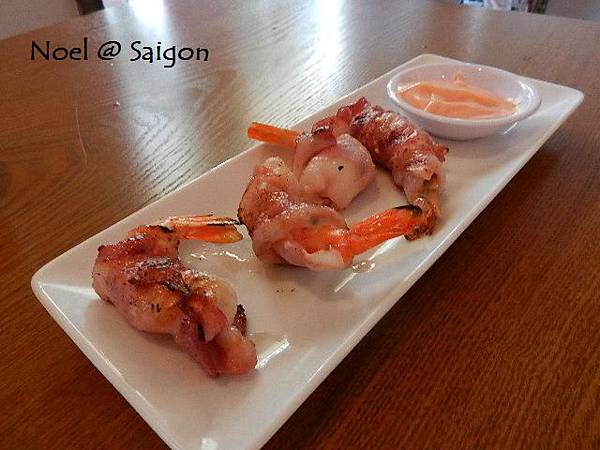 我們點了一道小菜和一道主菜!看似非常淒涼的前菜 Bacon whipped with Shrimps,但蝦子的口感不錯!