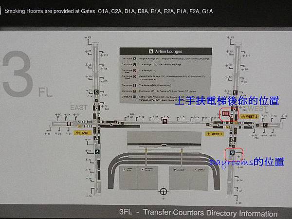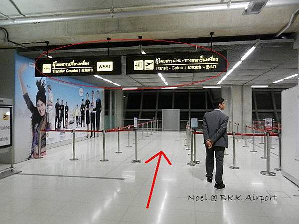 到達後,我忘了拍照!一上去會看到一張大牌子上面寫著Transit.Gates WEST 和 EAST!國際線不論轉機櫃台也好,Gates也好,都是在WEST 那邊﹔EAST那邊是泰國國內線的!