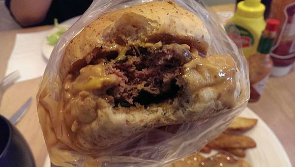 本人不喜歡吃東西弄髒手,所以會帶三明治袋套著吃… 你看看那個厚度, 我已經咬了兩次… 還是… 但真的真的很好吃!!